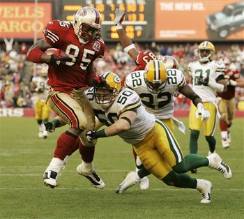 El TE es un jugador de la linea que puede salir a pase y ayudar al bloqueo. Un jugador muy polivalente que suele ser el as en la manga de muchos equipos. Aqui tenemos al Tight End de los 49ers Veron Davis siendo placado justo despues de recibir un pase.